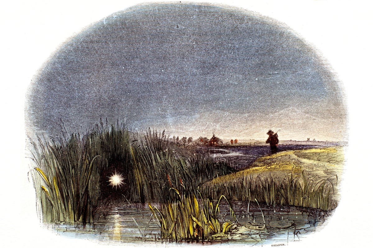 An illustration of an ignis fatuus, or will-o’-the-wisp, by Josiah Wood Whymper from the book Phenomena of Nature (1849).