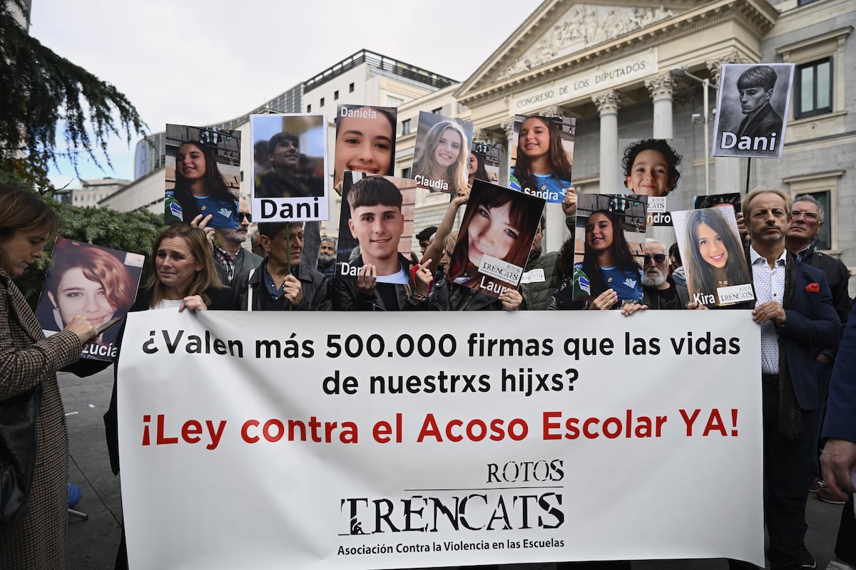 Coincidiendo con el Día Internacional contra la Violencia y el Acoso Escolar, asociaciones de familiares, como la entidad barcelonesa Trencats, que preside el padre de la niña Kira López, se han concentrado ante la Cámara Baja para criticar el “trato de abandono” que han recibido por parte de la Administración y visibilizar el sufrimiento de miles de víctimas de esta violencia en los centros educativos. “¿Cuántos niños tienen que morir? Hay que legislar ya”, han reclamado.